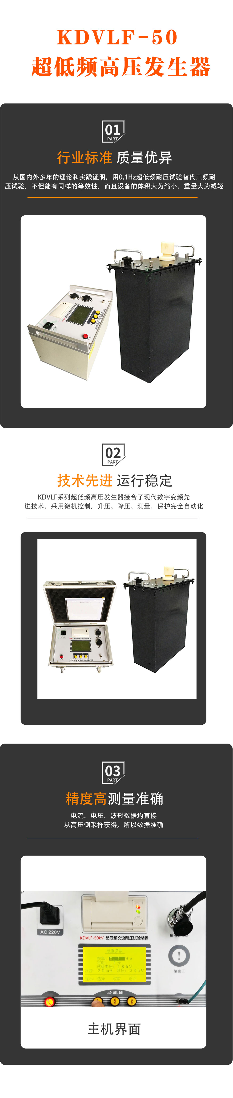KDVLF-80 超低頻高壓發生器主要用于電力部門對PE(聚乙烯)/XLPE(交聯聚乙烯)等塑料電力電纜的非破壞性絕緣耐壓試驗,具有電源過流、高壓過流、油箱過熱保護功能,輸出調壓器不回零高壓不能啟動等功能,是傳統工頻耐壓試驗設備的換代。KDVLF系列超低頻高壓發生器接合了現代數字變頻新的技術,采用微機控制,升壓、降壓、測量、保護自動化,并且在自動升壓過程中能進行人工干預。由于電子化,所以體積小重量輕、大屏幕液晶顯示,清晰直觀、且能顯示輸出波形、打印機輸出試驗報告。
