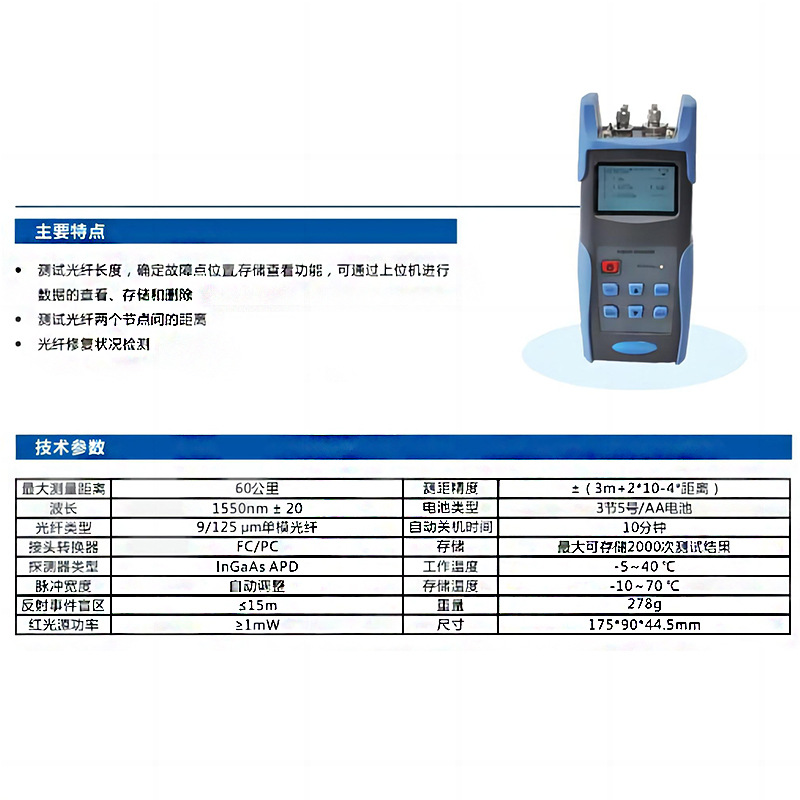①:最大探測距離60km是指,在動態(tài)范圍內(nèi)60km處可探測到>1dB的反射事件;非反射事件的探測距離為40km(>1dB)。