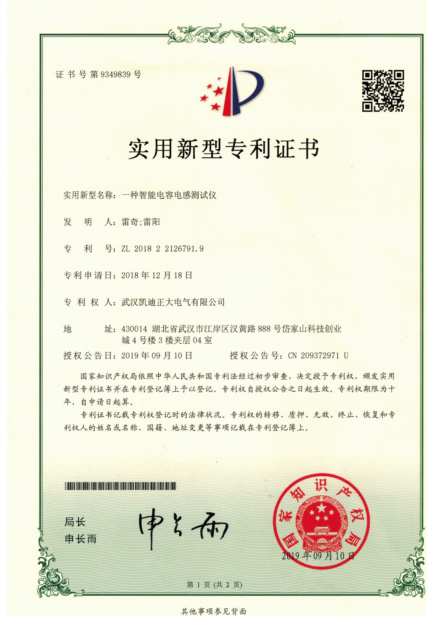 ![]() “KD-500A自動電容電感測試裝置”曾獲實用新型專利證書 |
