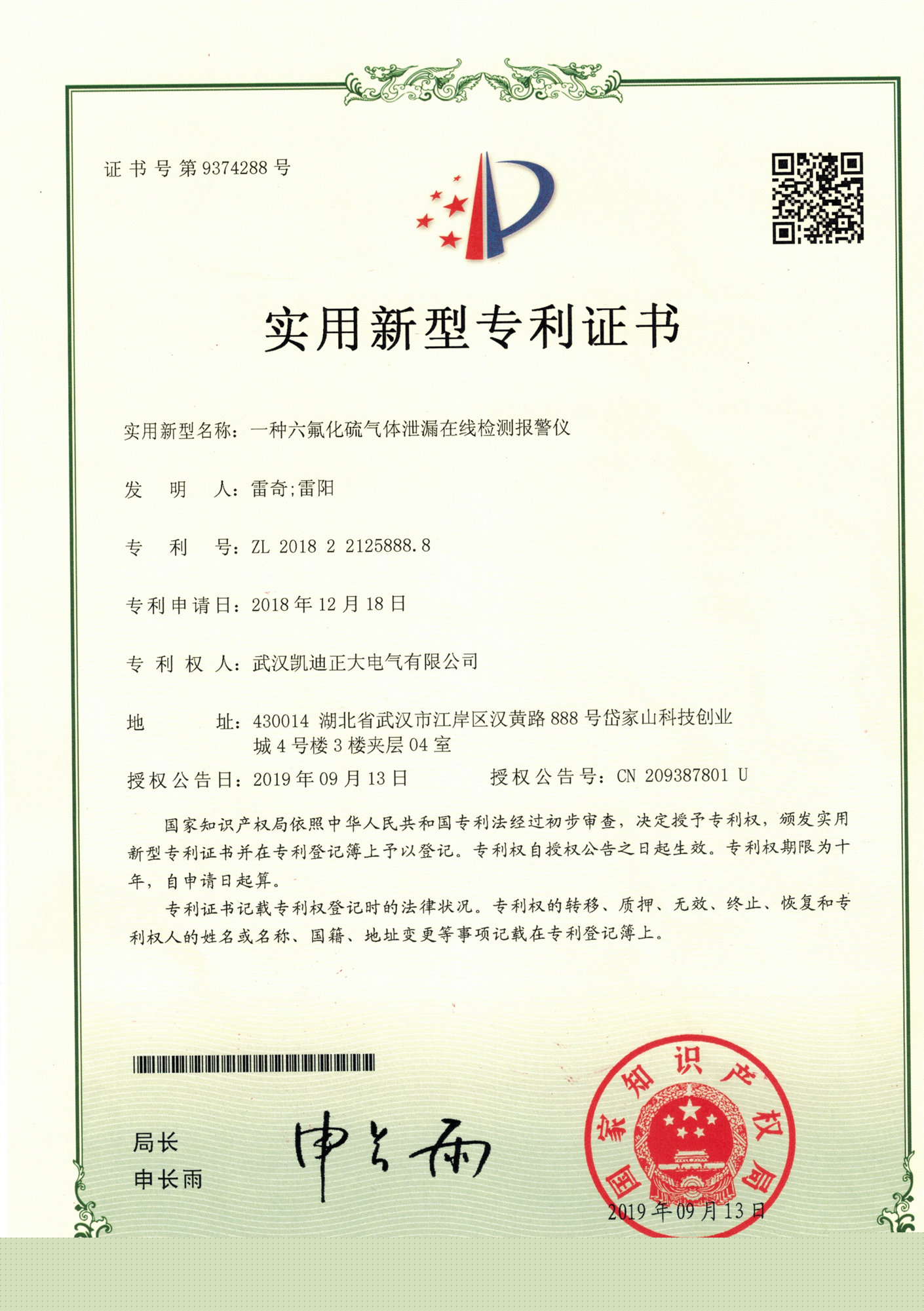 ![]() “KDXJ-8六氟化硫氣體泄漏報警系統(tǒng)”曾獲實用新型專利證書 |