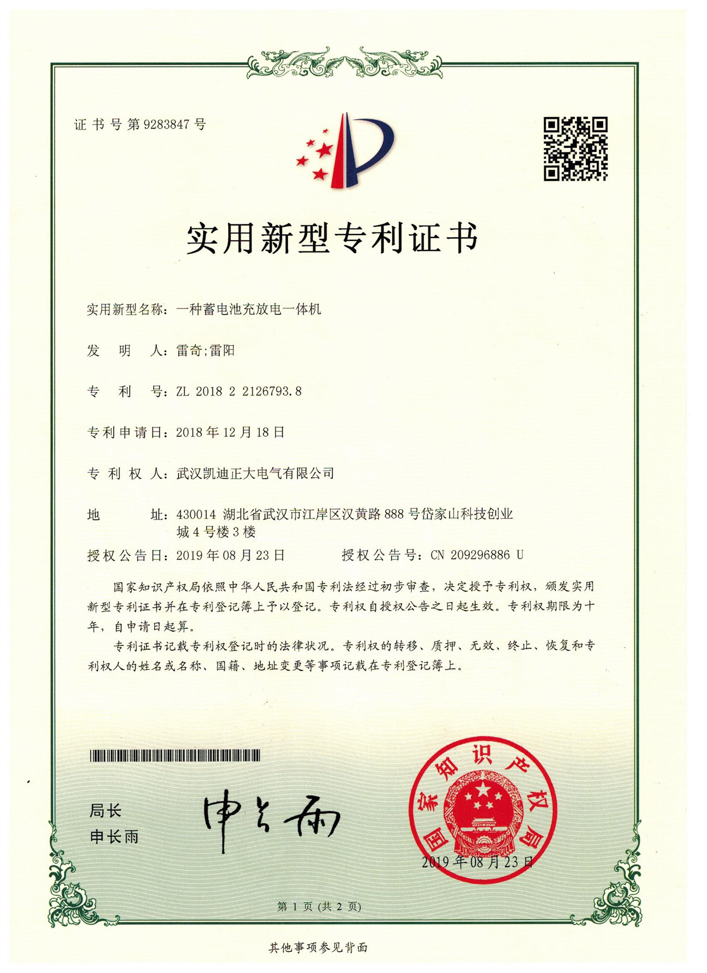 KDZD886蓄電池充放電一體機專利,一種用于蓄電池充放電一體機,證書號第:9283847號。專利號:ZL 2018 2 2126738.8 專利權人:武漢凱迪正大電氣有限公司