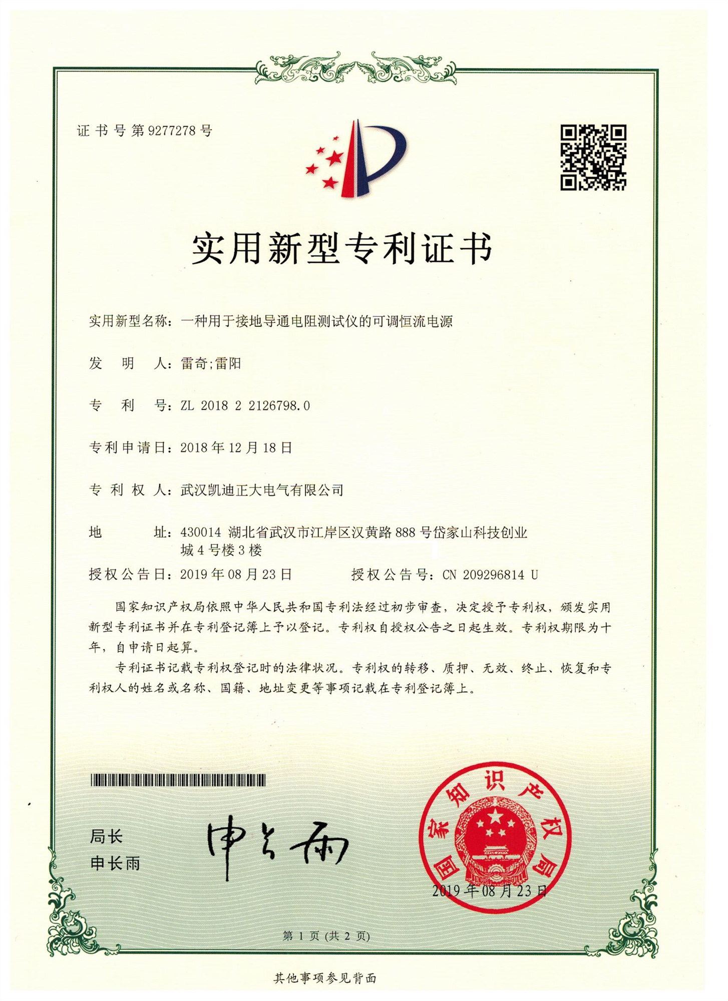 KDDT-10A接地引下線導通測試儀專利,一種用于接地導通電阻測試儀的可調恒流電源,證書號第:9277278號。專利號:ZL 2018 2 2126798.0 專利權人:武漢凱迪正大電氣有限公司