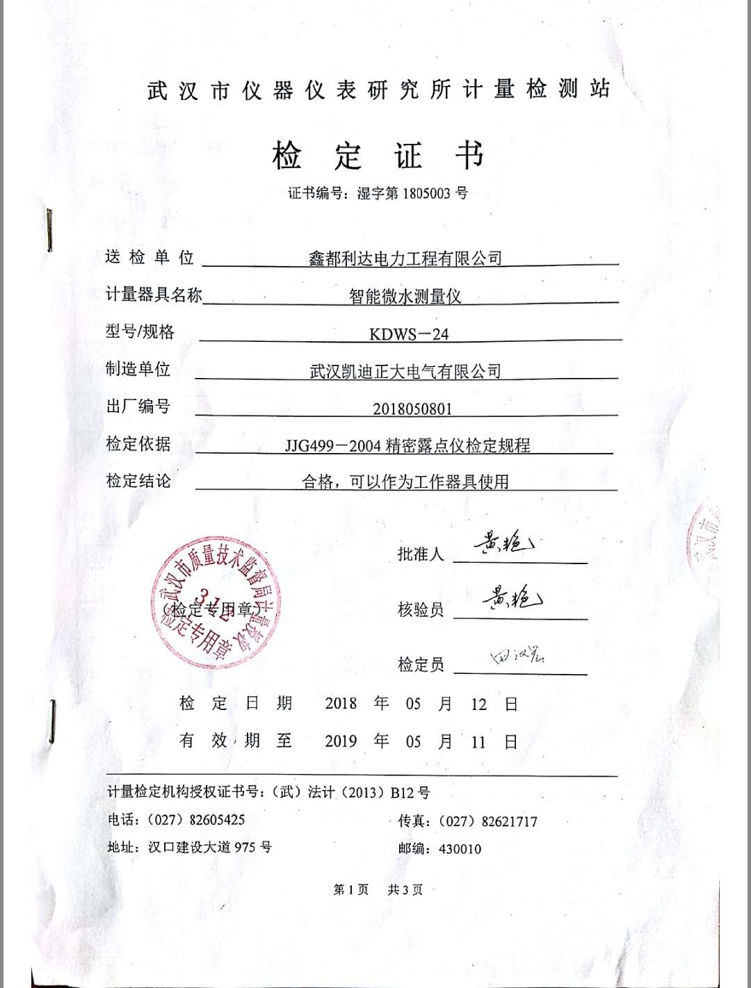 武漢市儀器儀表研究所計量檢測站,計量檢定機構(gòu)授權(quán)證書:(武)法計(2013)B12號。武漢凱迪正大電氣有限公司生產(chǎn)的KDWS-24智能微水測量儀,出廠編號2018050801,符合檢定依據(jù)JJG499-2004精密露點儀檢定規(guī)程,可以作為工作器具使用。獲得武漢市儀表研究院計量站檢定證書,證書編號:濕字第1805003號。