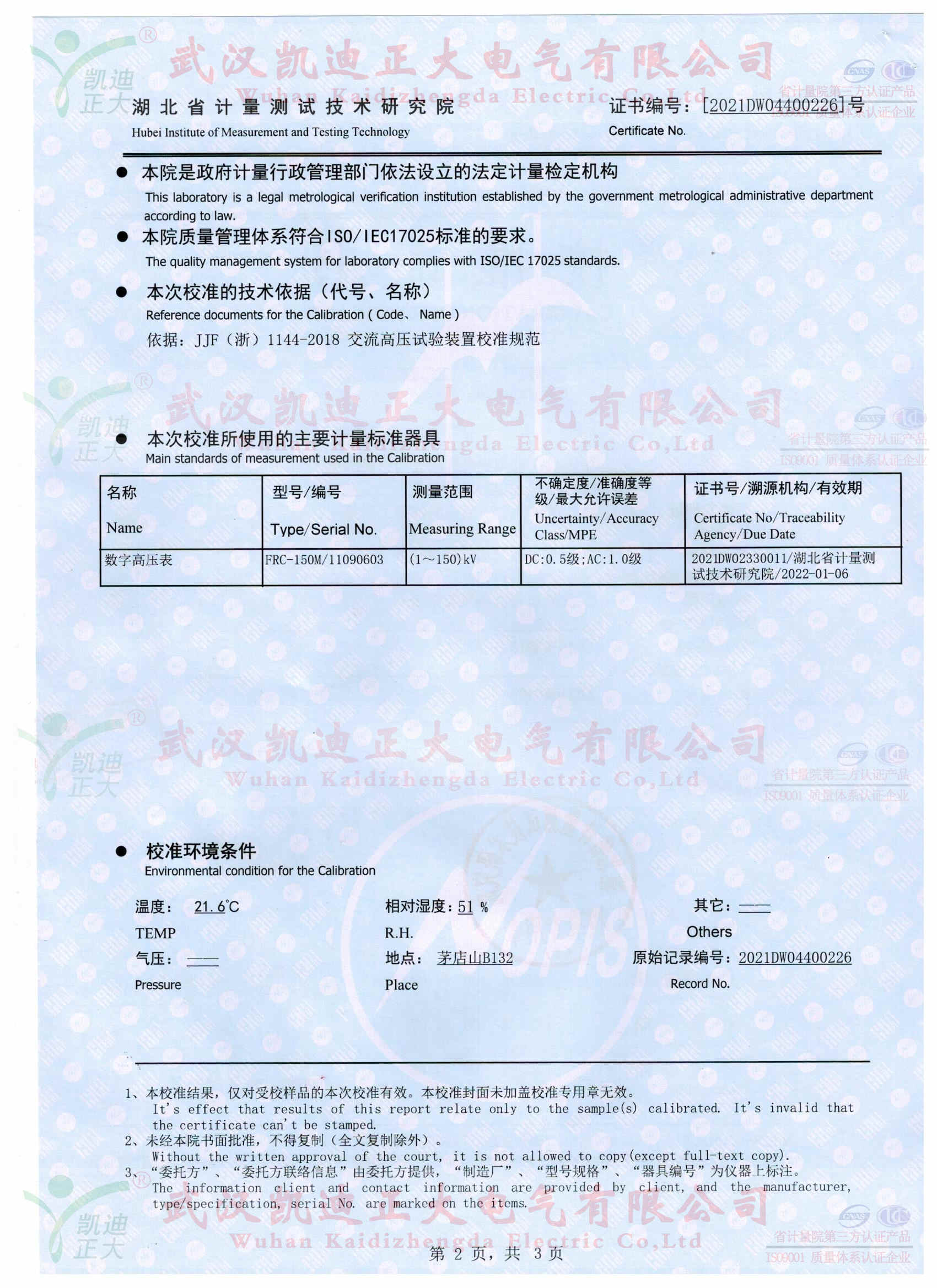 KDJS-8自動絕緣靴手套耐壓泄漏電流測試儀獲得湖北省計量測試技術研究院校準證書,證書編號《2021DW04400226》,采用FRC-150M數字高壓表檢定電壓合格、產品各項指標均符合國標的要求。按《電力安全工器具預防性試驗規程》要求對絕緣鞋、絕緣手套等安全工器具進行智能化絕緣耐壓試驗,絕緣靴及絕緣手套耐試驗周期為半年,試驗過程中不允許擊穿,同時絕緣靴絕緣絕緣手套泄漏電流不大于限定值。產品適用于大多數與電力相關行業。