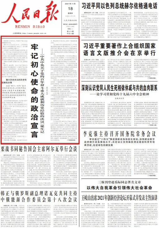 11月16日,隨著新華社發(fā)向全球的電波,《中共中央關(guān)于黨的百年奮斗重大成就和歷史經(jīng)驗的決議》對外公布。
