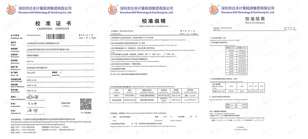 產品通過校準,意味著KDJF-IV局部脈沖探測儀的各項性能指標均達規(guī)定的標準,能夠在實際應用中提供準確、可靠的探測數據。準確的探測數據,為技術人員提供科學的決策依據,及時發(fā)現并處理潛在的設備故障,從而有效避免安全事故的發(fā)生,保障電力系統(tǒng)的穩(wěn)定運行。