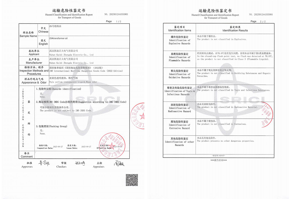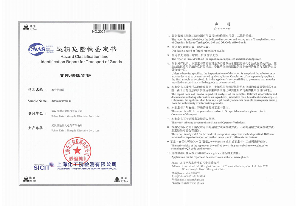 運輸危險性鑒定過程與結(jié)果詳解在國際海運中,危險品的運輸管理有著嚴格的標準與規(guī)范,油式試驗變壓器所用的絕緣油作為液體類物質(zhì),是否屬于易燃易爆危險品,需通過專業(yè)的運輸危險性鑒定予以確認。為此,武漢凱迪正大委托上?;ぴ簷z測有限公司對KD2675設(shè)備中使用的25號絕緣油進行了全面檢測。