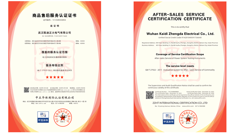 商品售后服務認證針對“電力系統測試儀器的售后服務”,并榮獲 五星級 最高評價,這直接證明了公司在售后服務領域擁有規范、高效、客戶至上的服務體系,客戶滿意度和品牌信譽獲得了國家級標準的認可。